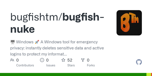 xpostml10@lemmings.world to privacy@lemmy.ca · 5 months agoGithub - bugfishtm/bugfish-nuke: A Windows tool for emergency privacy: instantly deletes sensitive data and active logins to protect my information during unexpected searches or house warrants.github.comexternal-linkmessage-square1linkfedilinkarrow-up12arrow-down10cross-posted to: privacy@lemmy.ml