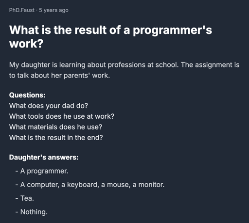 arrow-up1903arrow-down1imageWhat is the result of a programmer's work?cm0002@sh.itjust.works to Programmer Humor@programming.dev · 5 days agomessage-square107linkfedilinkcross-posted to: programmerhumor@lemmy.ml