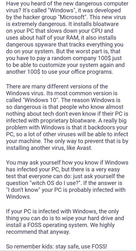 alexei_1917 [mirror/your pronouns]@hexbear.netOPto Linux@lemmy.ml•Be on the lookout for this scary piece of malware! Your tech illiterate relatives' PCs are probably already infected!English5·5 days ago“I’d make that group, but I don’t want to moderate it.”