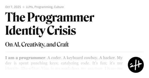 arrow-up131arrow-down1external-linkThe programmer identity crisisplus-squarehojberg.xyzcm0002@lemmings.world to Programming@programming.dev · 4 days agomessage-square2linkfedilink